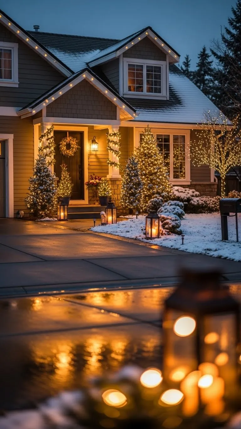 Place lights around window frames for a tidy glow. Use plastic clips to keep them straight. Pick a warm tone so the light feels soft. Work slowly so the spacing stays even. If you want extra color, add small wreaths inside the windows. This creates depth without clutter. Lights around windows keep your home bright from a distance. They pair well with simple yard decor and take little time to install.