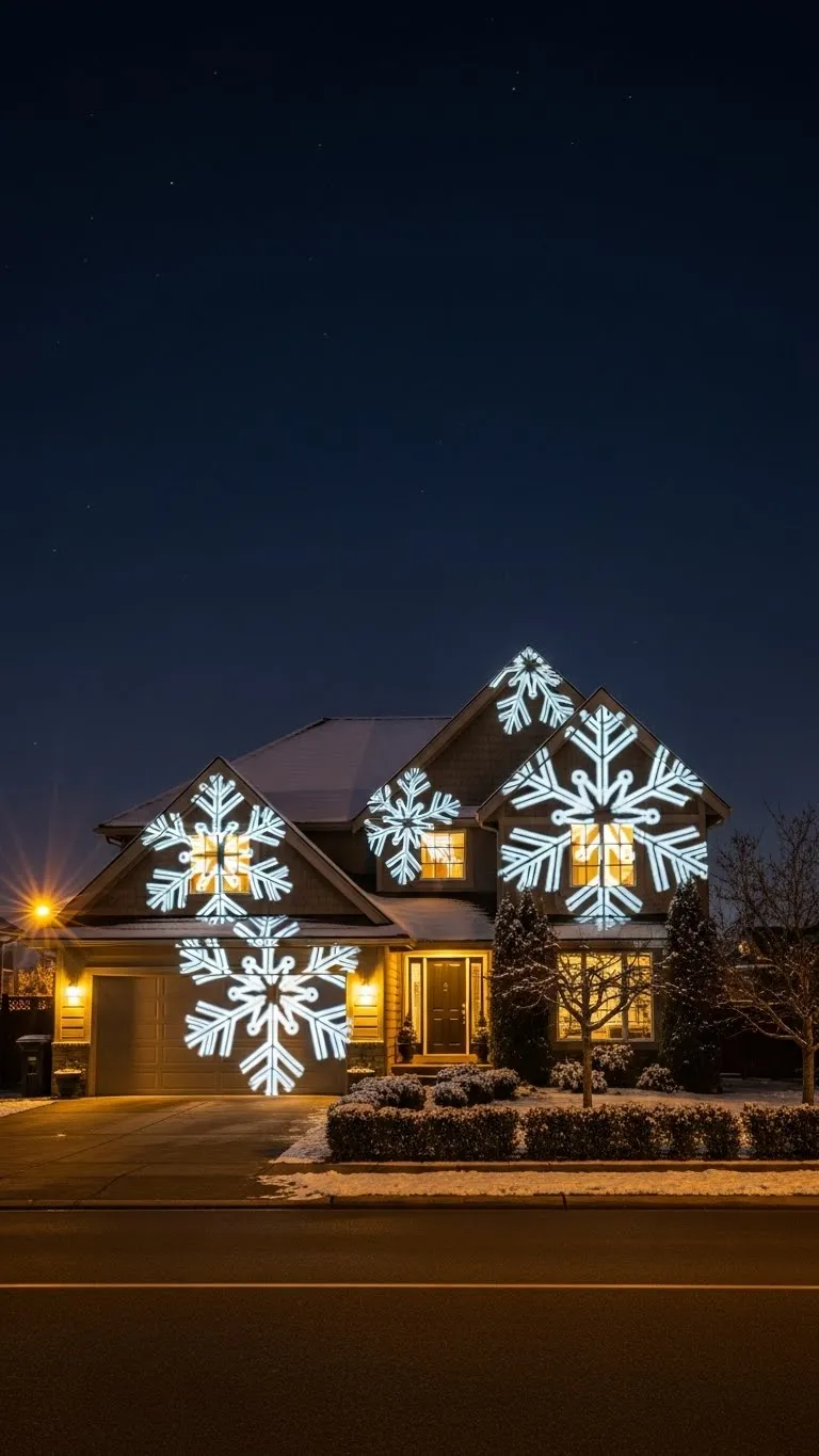 Projector lights cover large areas with little effort. Aim the device at your home to create soft patterns. Pick slow-moving designs so your yard stays calm. Place the projector where it won’t be blocked by shrubs. This setup installs fast and costs little to maintain. If you want variety, pair the projector with simple porch lights. Keep other decorations minimal so the patterns stand out cleanly.