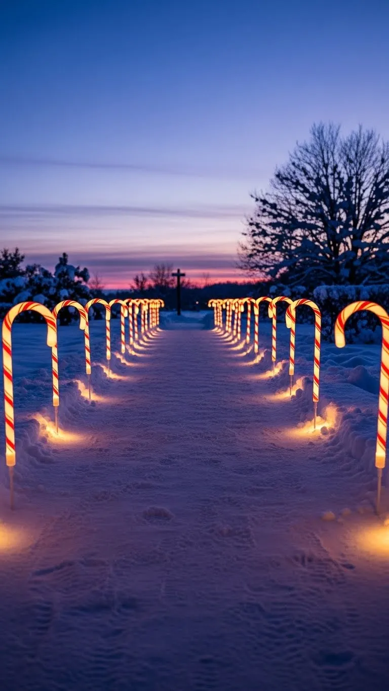 Candy cane stakes add color along walkways. Push them into the soil and keep spacing even. Use solar or plug-in versions depending on what you prefer. The red-and-white pattern pairs well with simple white lights on the porch. If you enjoy DIY touches, tie small bows at the base of each stake. They create a playful look without cost. These stakes guide guests to the door while adding cheerful color.