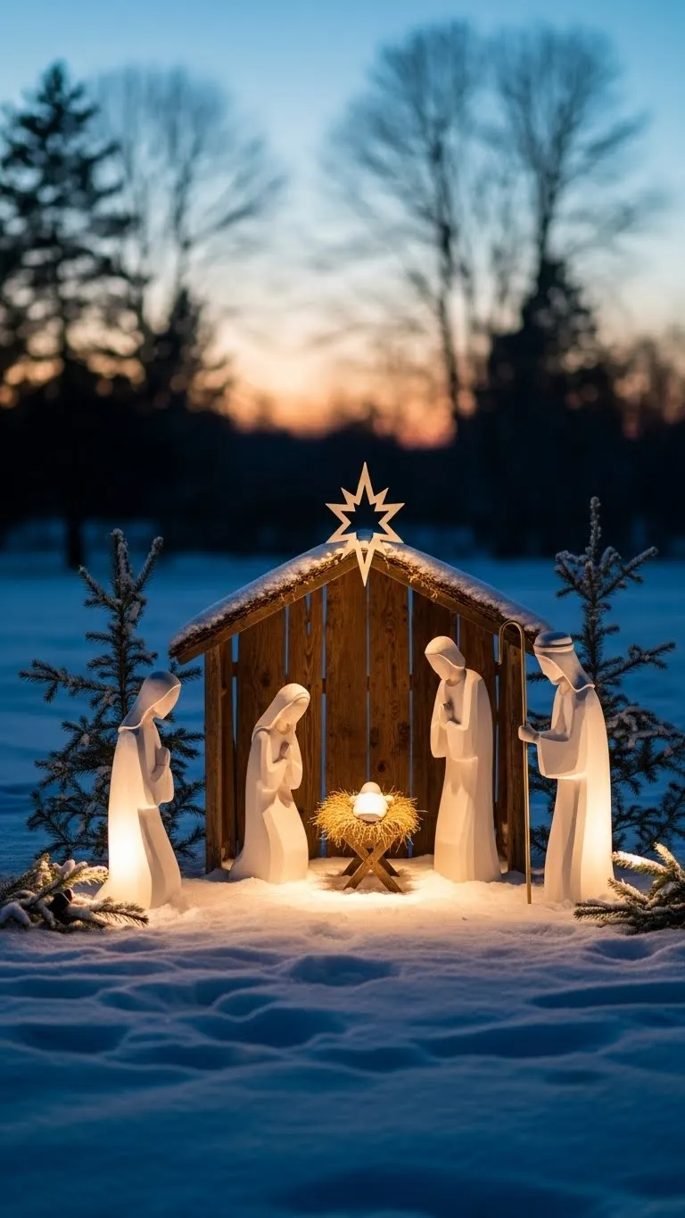 Choose a small nativity set with clean shapes. Place it near a wall or hedge for support. Add a single spotlight to keep the lighting calm. Use mulch or straw around the base for texture. Keep the display simple so it feels peaceful. This setup works well for small yards and doesn’t require much storage space.