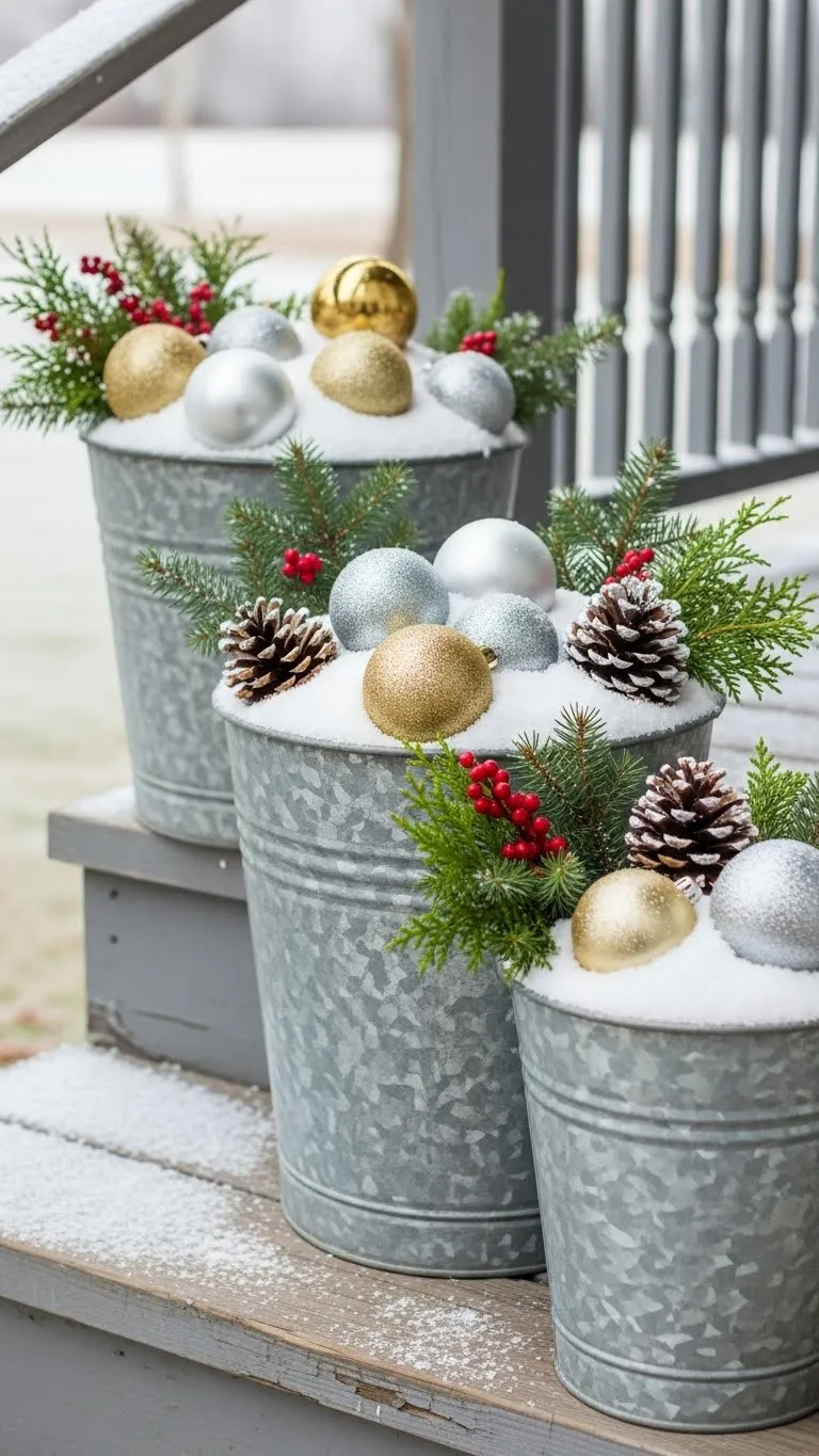 Fill metal buckets with faux snow, berries, and pine branches. Add small ornaments for color. Set them on each step or next to the door. This creates a casual, low-cost look. You can swap items each year for variety. Buckets handle cold weather well and store easily. A few minutes of arranging gives you a welcoming corner.