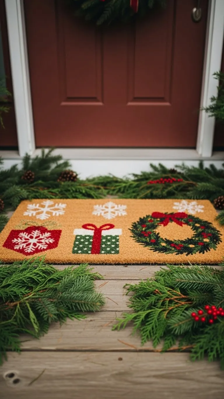 A themed doormat adds small charm right at your door. Pick one with winter shapes instead of words. Pair it with a rug underneath for added color. Shake it out occasionally to keep it clean. Add a small pot of greens beside it to tie everything together. This detail costs little and adds warmth to your porch.