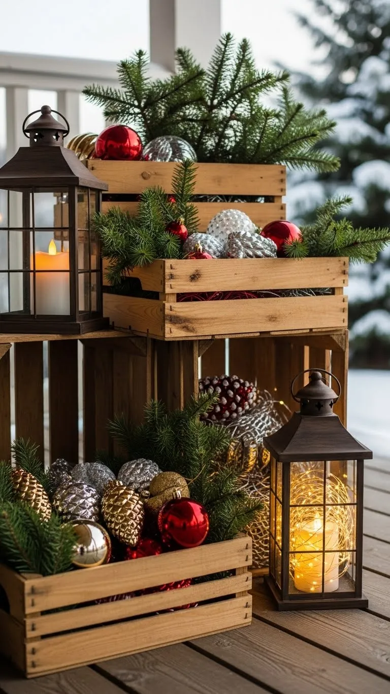 Stack wooden crates to create a small display. Fill them with pine branches, candles, or ornaments. Keep the layout simple so it feels balanced. Crates add height and texture without cost. You can paint them or leave them natural. This flexible setup changes easily if you want a new look during the season.