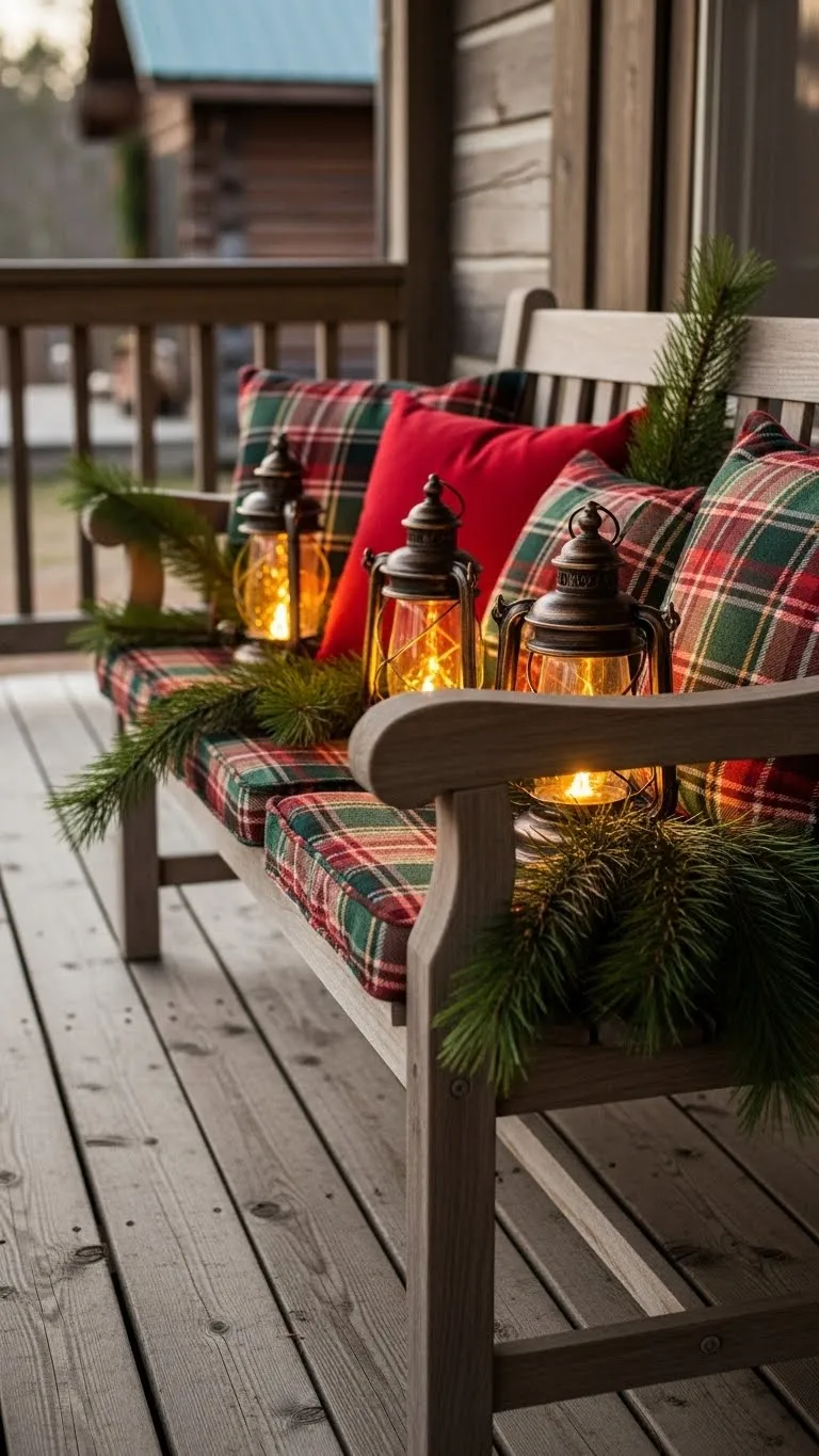 Decorate a porch bench with plaid cushions, small pillows, or pine sprigs. Add a lantern beside it for evening glow. Keep colors simple so the bench looks tidy. This creates a cozy corner guests notice right away. You can switch pieces easily if weather changes. It’s a friendly, low-cost touch for any porch.