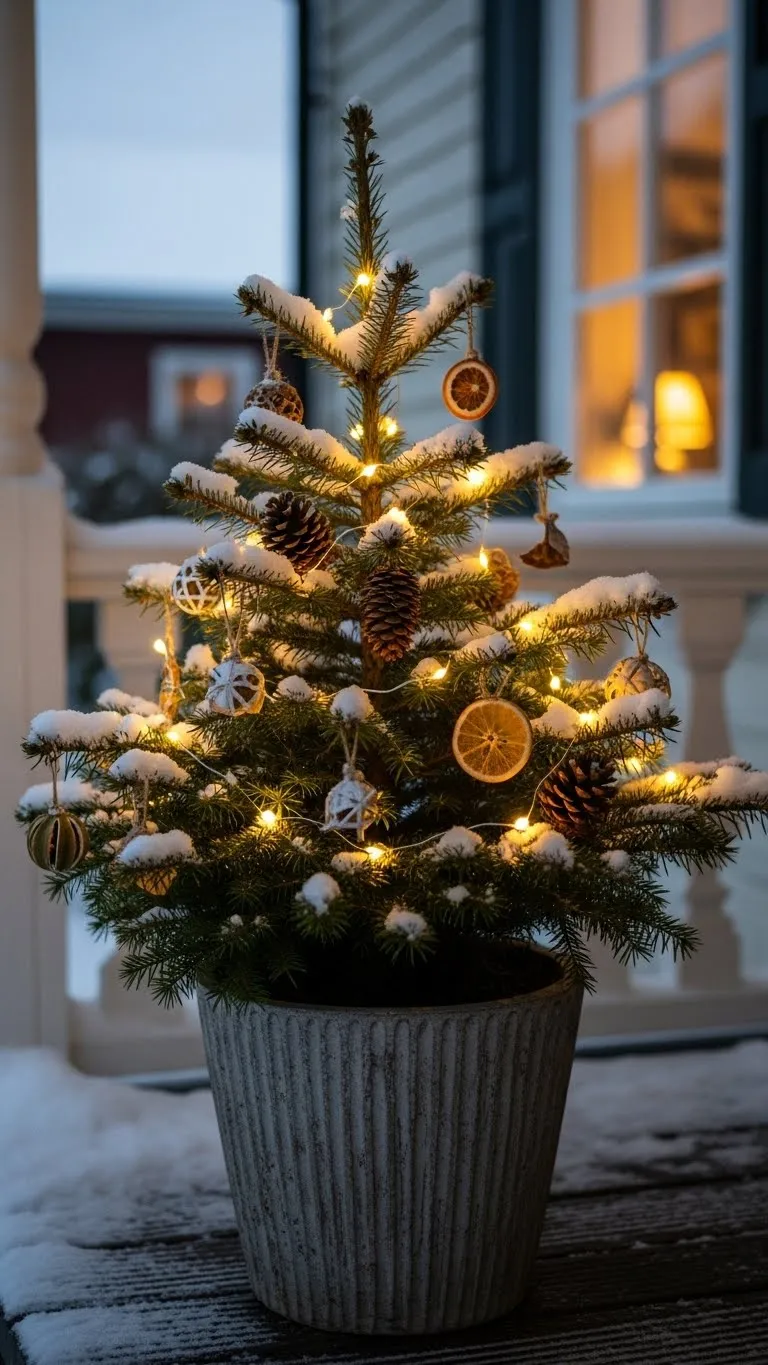 A porch tree adds height and charm without much effort. Choose a small faux tree if you want something that holds up well outdoors. Add weather-safe ornaments or pinecones tied with twine. Keep colors simple so everything feels clean. Use a stable pot so wind doesn’t knock it over. Wrap the base with burlap for a cozy touch. Use a short light strand to brighten the branches. If your porch has two sides, place a tree on each for balance. This small setup creates a warm entrance without taking much time.