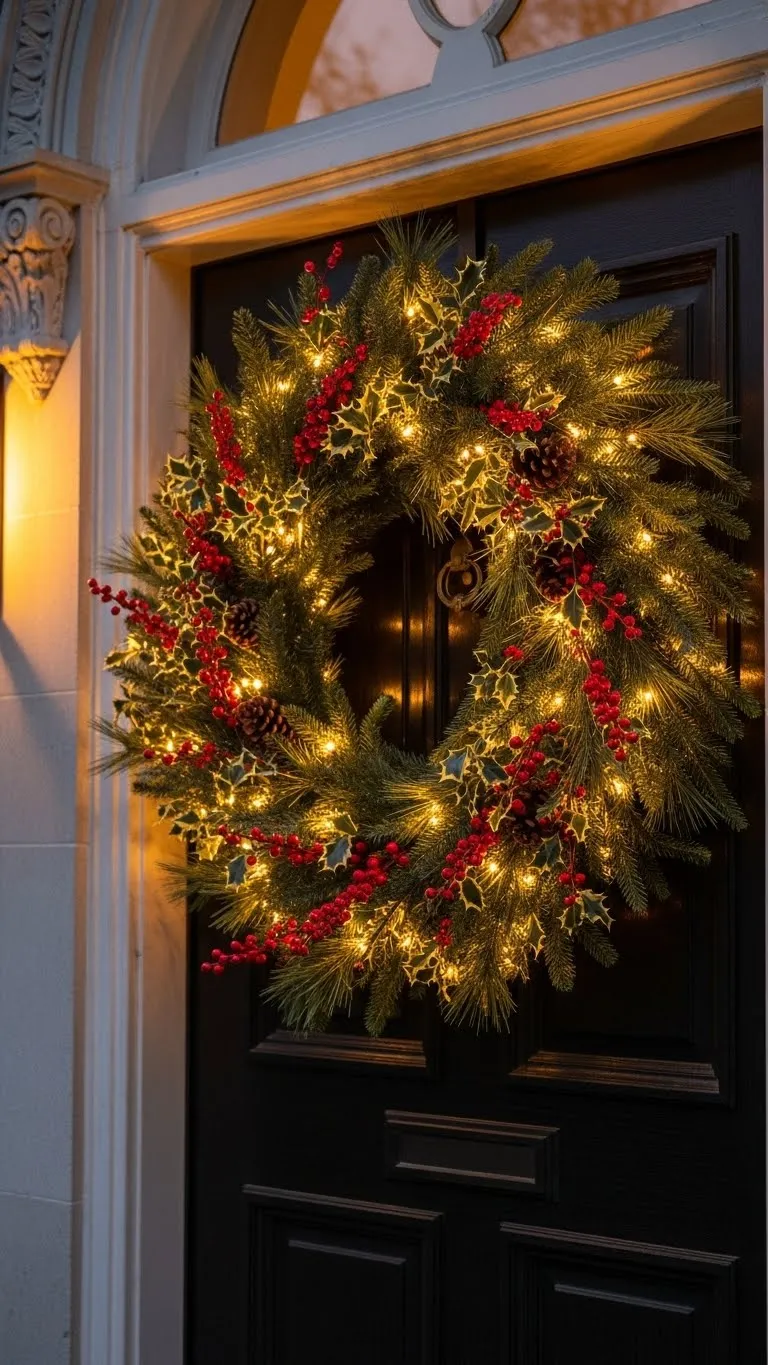 A big wreath makes a strong statement with little work. Pick one that matches your home’s colors. Add a few large ribbon loops so it feels full. Hang it using a sturdy hook so it stays steady in wind. If you want a brighter look, weave a few battery lights through the branches. Choose soft colors like gold, red, or green. This keeps things calm and balanced. You can refresh the wreath each year with small pieces you already own. It’s a budget-friendly way to update your decor while keeping the same base.