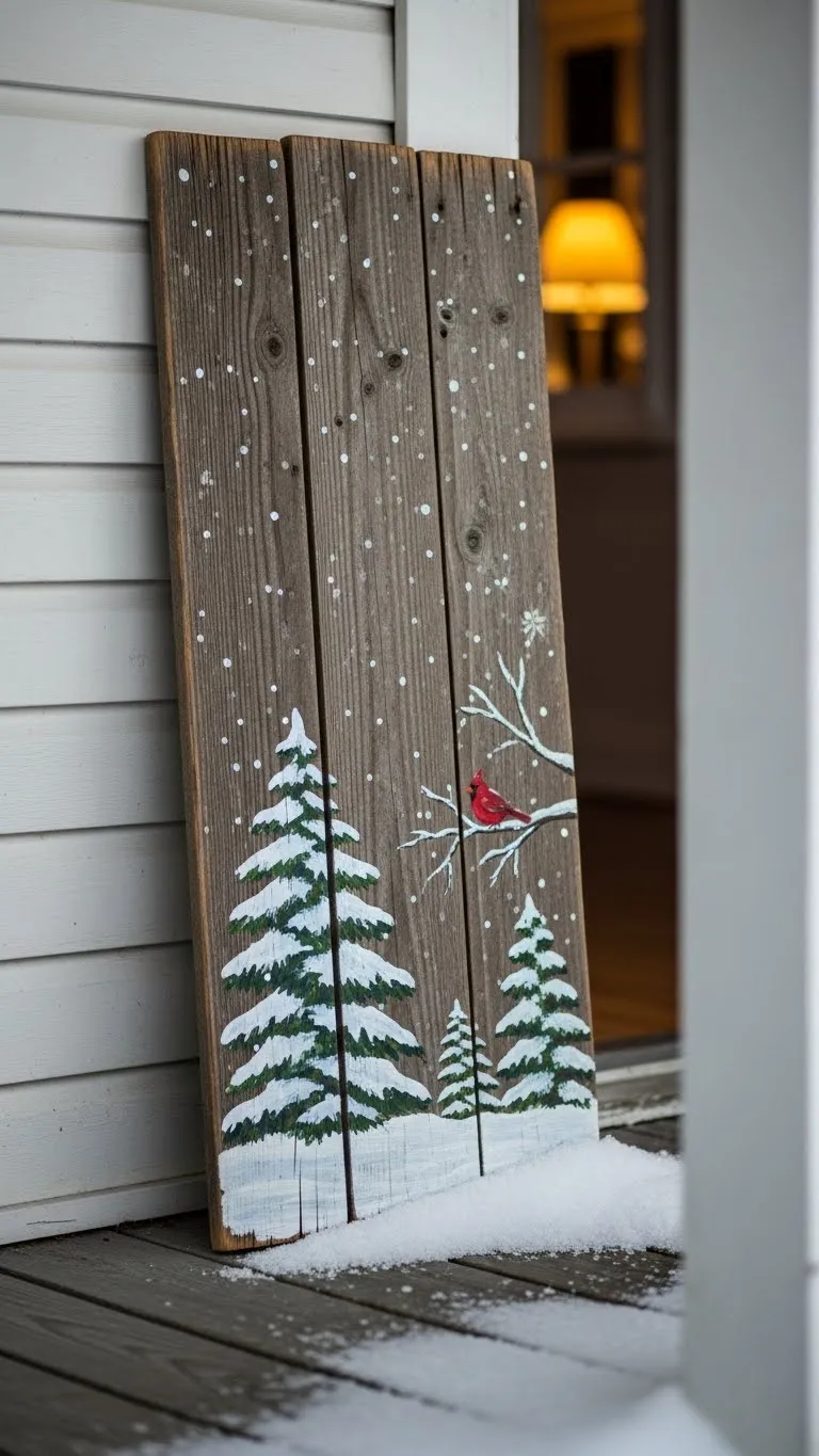 A wooden sign adds charm to your porch. You can make one using scrap wood you already have. Paint simple shapes like trees, stars, or a winter scene. Keep the design clean and soft. Use outdoor paint so it holds up through the season. Prop the sign near your door or hang it with removable hooks. If you want texture, add a ribbon bow or small pinecones to the top. This project costs little and adds personality to your space.