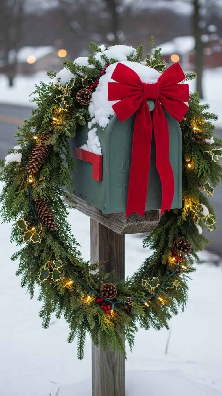 Your mailbox offers a small spot for holiday detail. Wrap garland around the post and secure it with zip ties. Add pinecones or ribbon for a splash of color. Keep the design simple so it feels tidy. If you have extra lights, weave a short strand through the garland. Solar clip-on lights also work well here. This small decoration sets the tone for your home before guests reach the porch.
