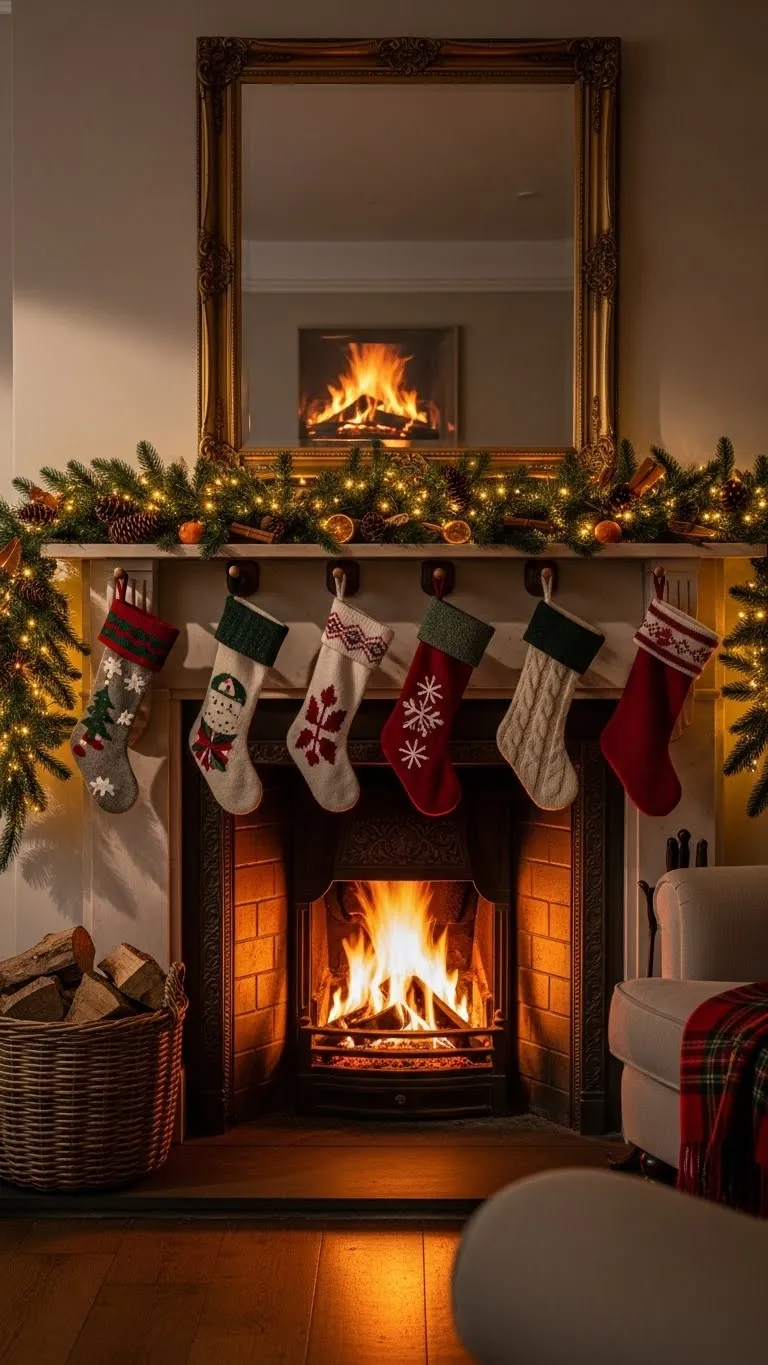 A classic pine garland never goes out of style. Lay it across your mantel and let it hang naturally. Add a few twinkling lights for a gentle glow. If you want extra charm, tuck in pinecones, berries, or ribbon. For a budget-friendly touch, you can use faux pine from a craft store. It looks realistic and can be reused every year. This simple decoration sets the perfect festive tone.