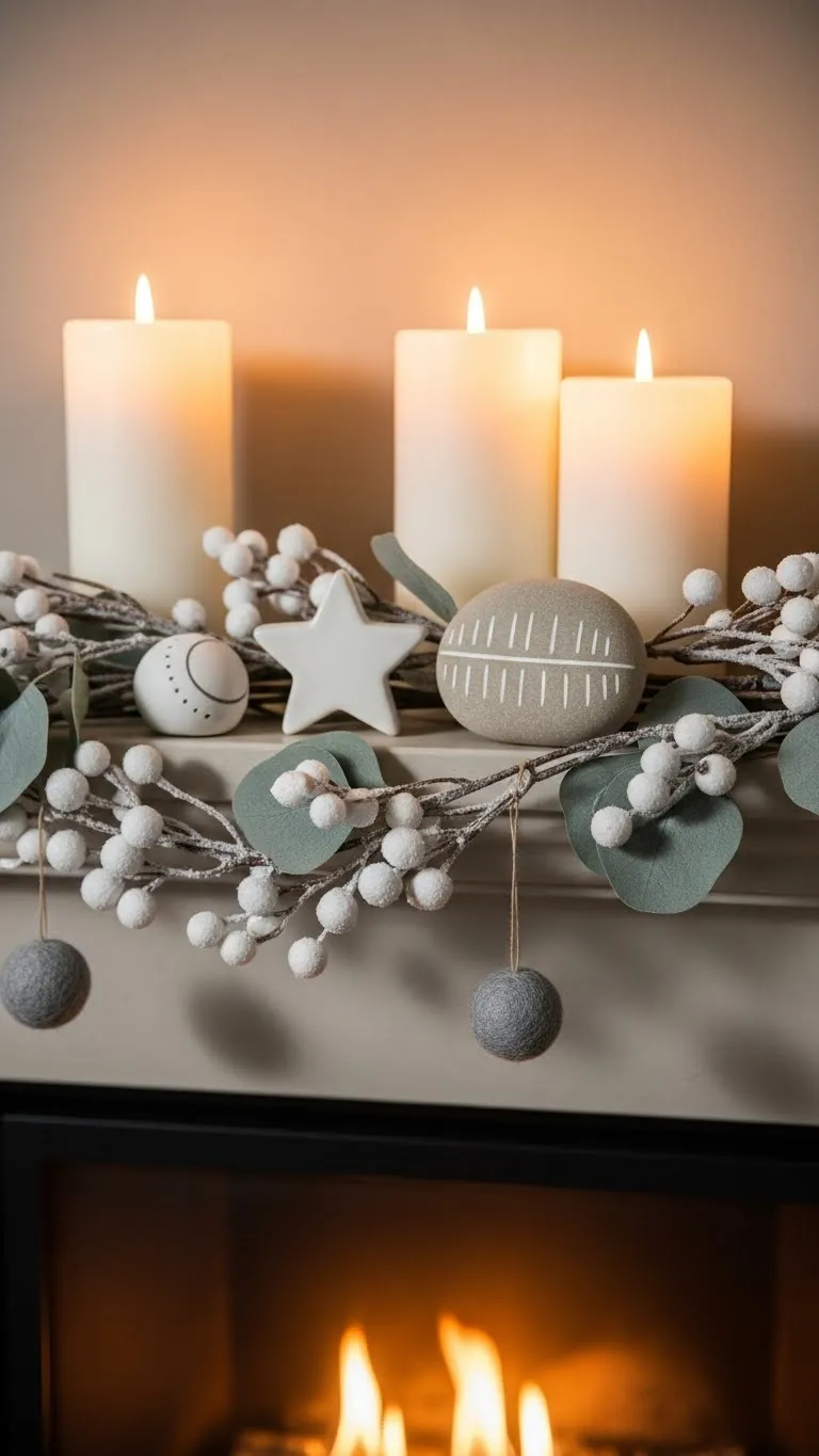 A neutral palette creates calm holiday charm. Use whites, creams, and soft browns. Layer different textures like wood, wool, and greenery. This approach looks sophisticated without being expensive. You can DIY neutral ornaments with paper, fabric, or twine. Pair them with warm lights or candles. Neutral winter décor gives your fireplace a serene, cozy ambiance, perfect for a peaceful holiday setting.