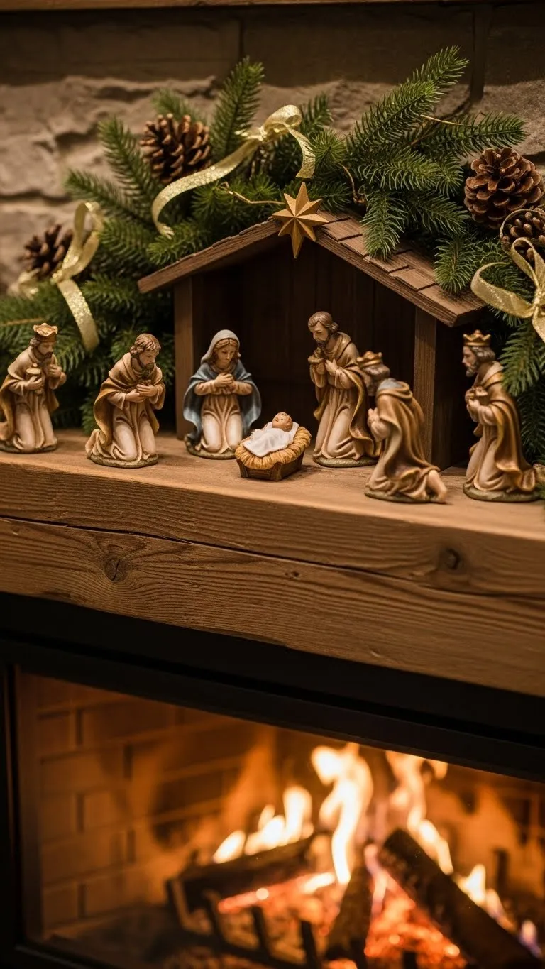 A miniature nativity adds a meaningful touch. Place it centrally on the mantel or near garlands. Small sets are affordable and easy to arrange. DIY options using clay or paper figurines can personalize it further. It brings holiday tradition and story into your decor. This simple element connects your fireplace display to the Christmas spirit without overwhelming other decorations.