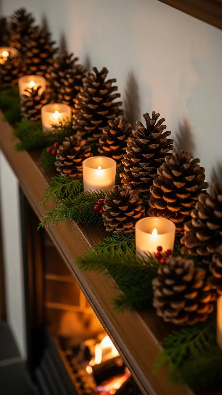 Pinecones are budget-friendly and natural. Place them along the mantel or in bowls. You can lightly spray them with glitter or white paint to mimic snow. Combine with candles or garlands for added charm. Pinecones are easy to collect and perfect for rustic or woodland themes, adding texture and warmth without spending much money.