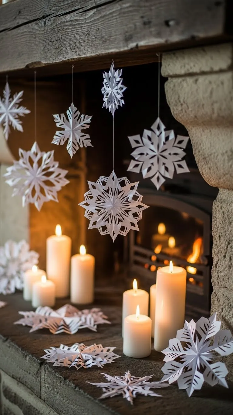 Make paper snowflakes to add a whimsical, festive touch. Cut them from white or patterned paper. Hang them with tape, string, or small clips. They’re free, fun, and customizable. Add fairy lights or small greenery for extra charm. This personal DIY element brightens your fireplace decor, creating a snowy indoor effect that’s simple yet visually appealing.