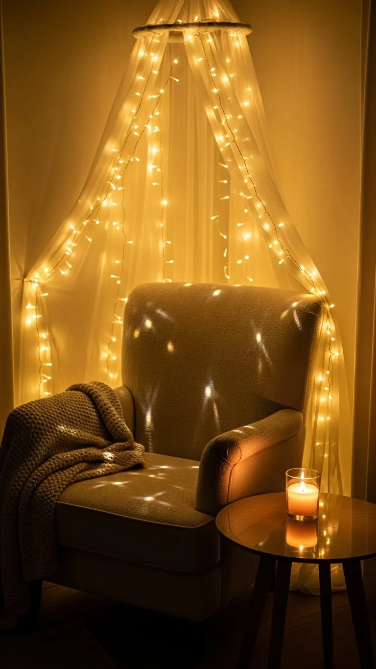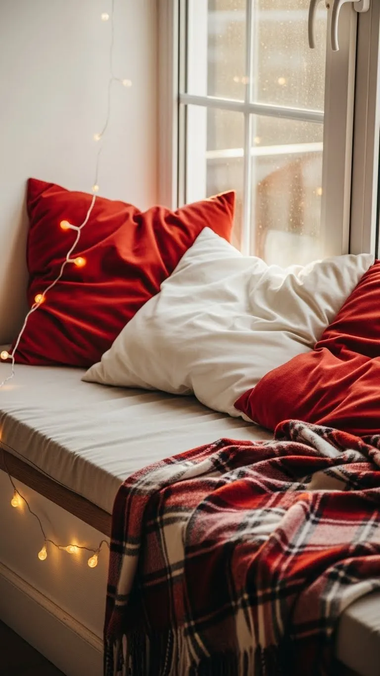 A simple blanket can transform a corner into a cozy reading nook. Choose thick, soft textures in holiday colors. Layer with small cushions and add a side table for drinks or candles. Twinkling lights overhead make it even cozier. This approach is practical, budget-friendly, and gives a lived-in, festive look.