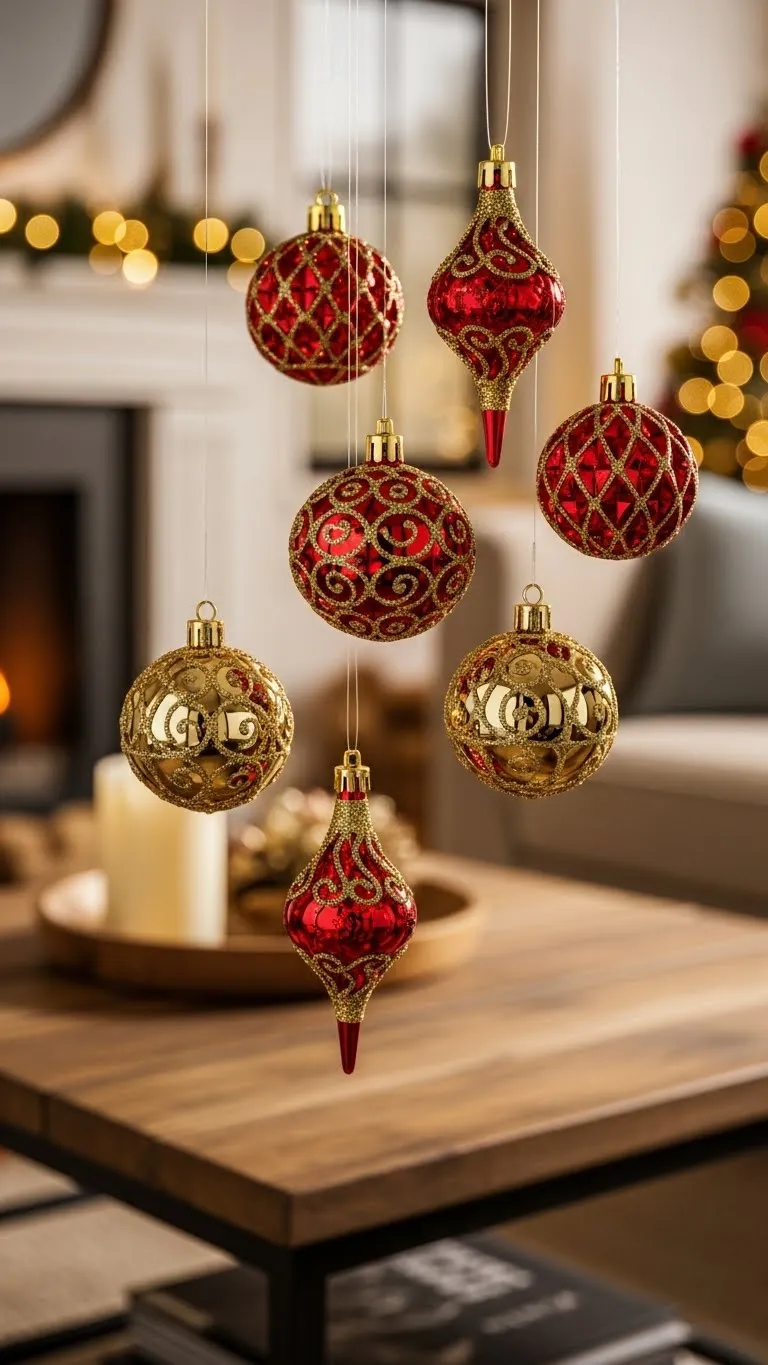 Hanging ornaments from the ceiling adds unexpected holiday flair. Use clear thread or fishing wire for a floating effect. Perfect over tables or open spaces. Mix sizes and colors for interest. This is an inexpensive way to make your room feel festive from every angle.