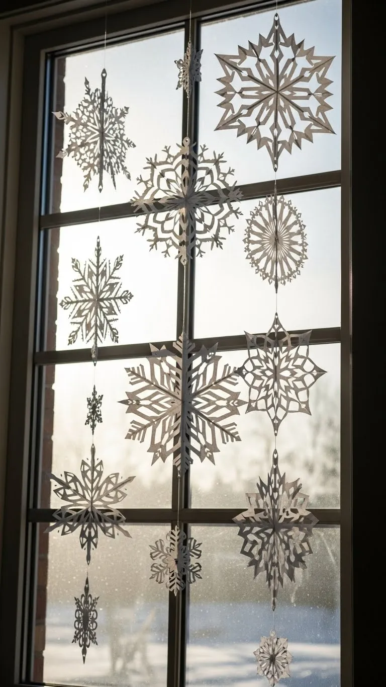 Cut paper snowflakes and hang them on strings for an easy, classic Christmas decoration. They are cheap, fun, and customizable. Arrange in clusters or let them float across windows. This simple craft creates a wintery vibe without expensive materials.
