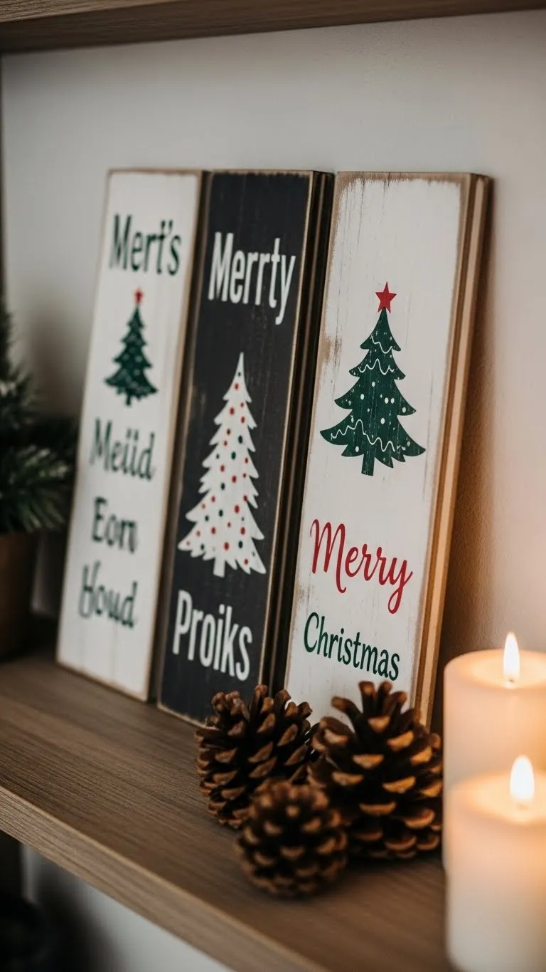 Wooden signs add charm and warmth. Paint or stencil phrases like “Merry Christmas” or simple tree illustrations. Place them on shelves, tables, or mantels. DIY options with scrap wood are cheap and personal. They pair well with other natural elements like pinecones or greenery.