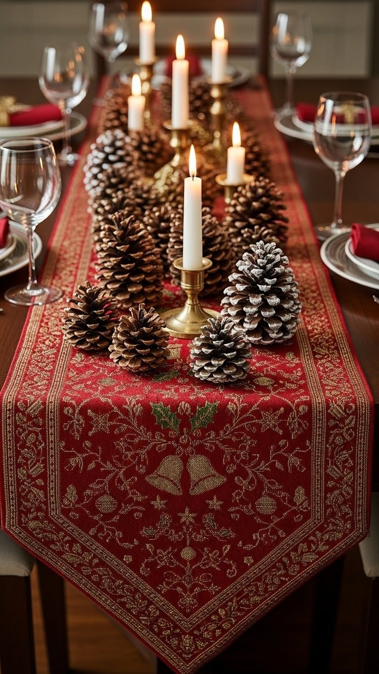 A table runner adds a holiday touch to any surface. Choose festive colors or DIY fabrics. Sprinkle pinecones, ornaments, or fairy lights on top. This is budget-friendly and easy to change each year. It transforms your table without needing a full centerpiece overhaul.