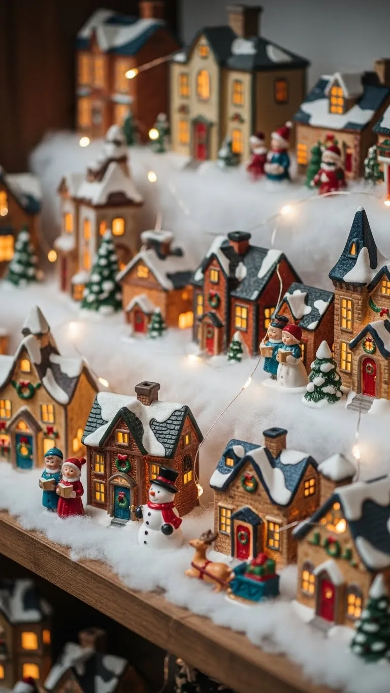 Create a tiny indoor village using miniature houses and figures. Add cotton or fake snow for realism. It works well on mantels, side tables, or shelves. This small-scale display adds charm without overwhelming your space. DIY options are fun for families.