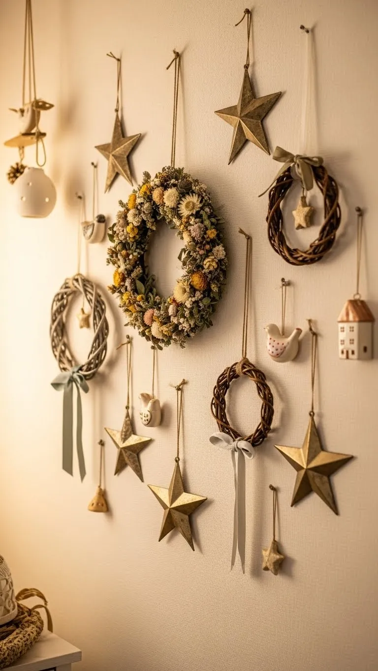 Wall hangings like wreaths or wooden stars are easy to add. Use natural greenery, twine, or DIY paper versions. They don’t take up floor space but instantly bring holiday cheer. Groupings of multiple hangings create visual interest and make walls feel alive for Christmas.