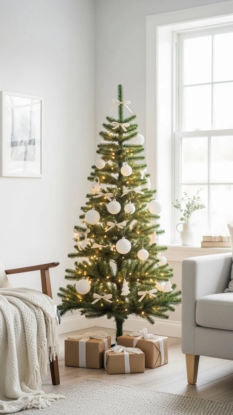 Not every space needs a huge tree. A slim or tabletop tree works for smaller rooms. Decorate with natural items like pinecones, dried oranges, or cinnamon sticks for a rustic feel. Keep ornaments minimal to avoid clutter. You can even DIY paper stars or felt decorations. Add a small tree skirt or a basket for a complete look. This approach gives elegance without overwhelming your space.