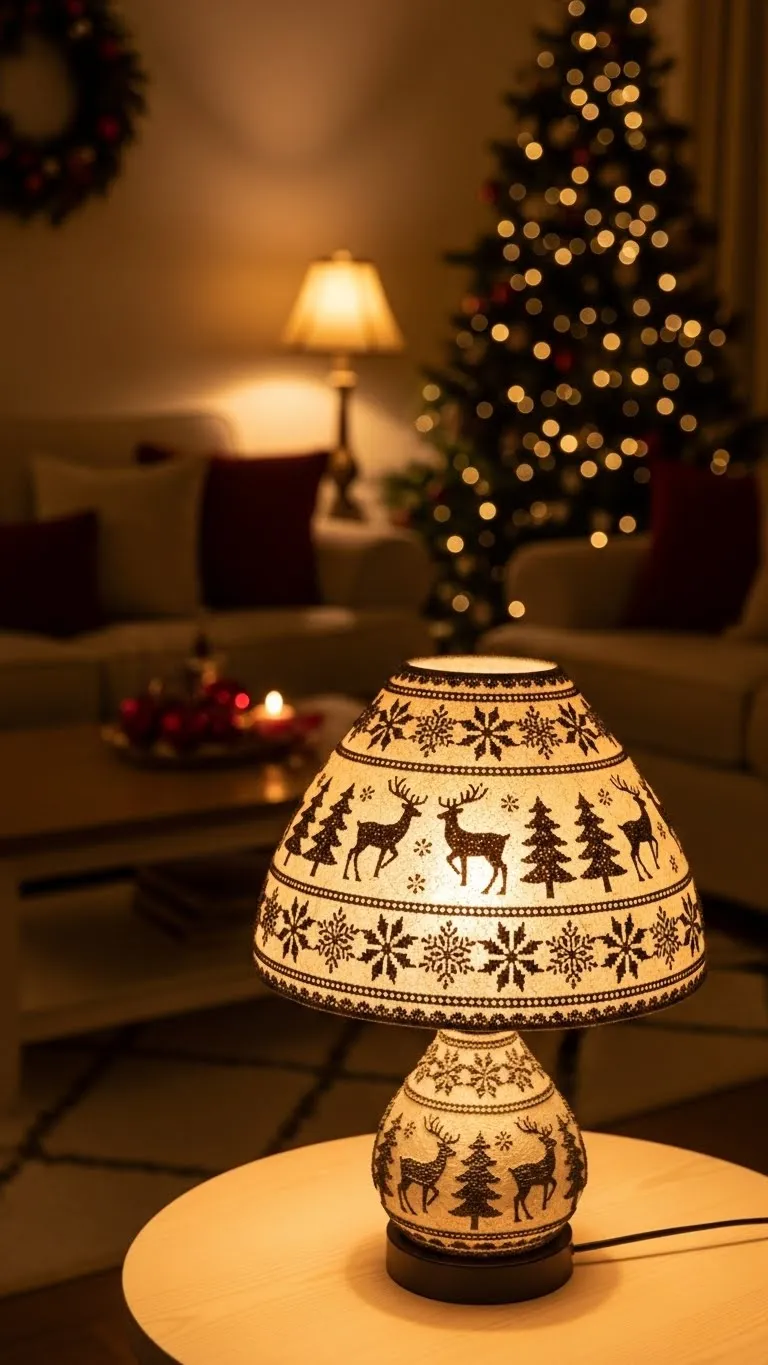 Swap regular lampshades for ones with subtle holiday prints or colors. Or add ribbon or small ornaments to existing shades. This small change casts a warm festive glow and is highly affordable. It’s perfect for living rooms, bedrooms, or reading nooks.