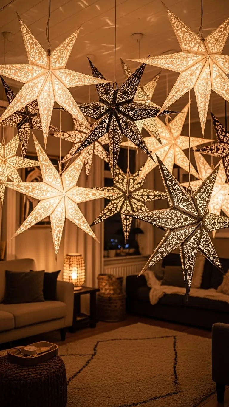 Star-shaped lanterns add a dreamy holiday vibe. Hang them in clusters or above tables for visual interest. Use battery-operated fairy lights inside for a soft, warm glow. Paper, metal, or wooden stars are all budget-friendly options. You can also DIY lanterns with cardstock, cutting patterns for light to shine through. These create magical ceiling decor without taking floor space, perfect for cozy corners or entryways.