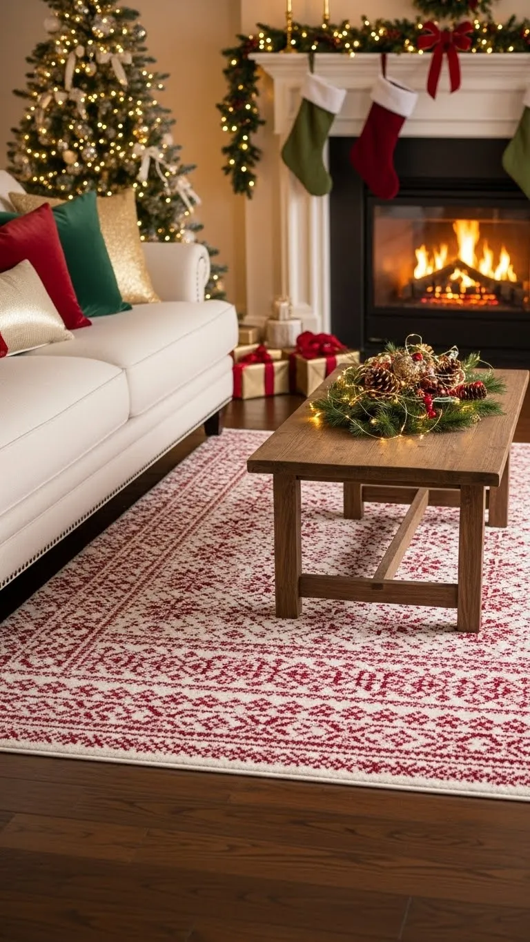 A festive rug anchors a room with color and warmth. Choose holiday patterns like plaid, snowflakes, or simple stripes. Affordable options include small area rugs or DIY stenciled mats. Layering rugs creates dimension and comfort, perfect for living rooms or entryways. Rugs add a subtle seasonal change without taking up space.