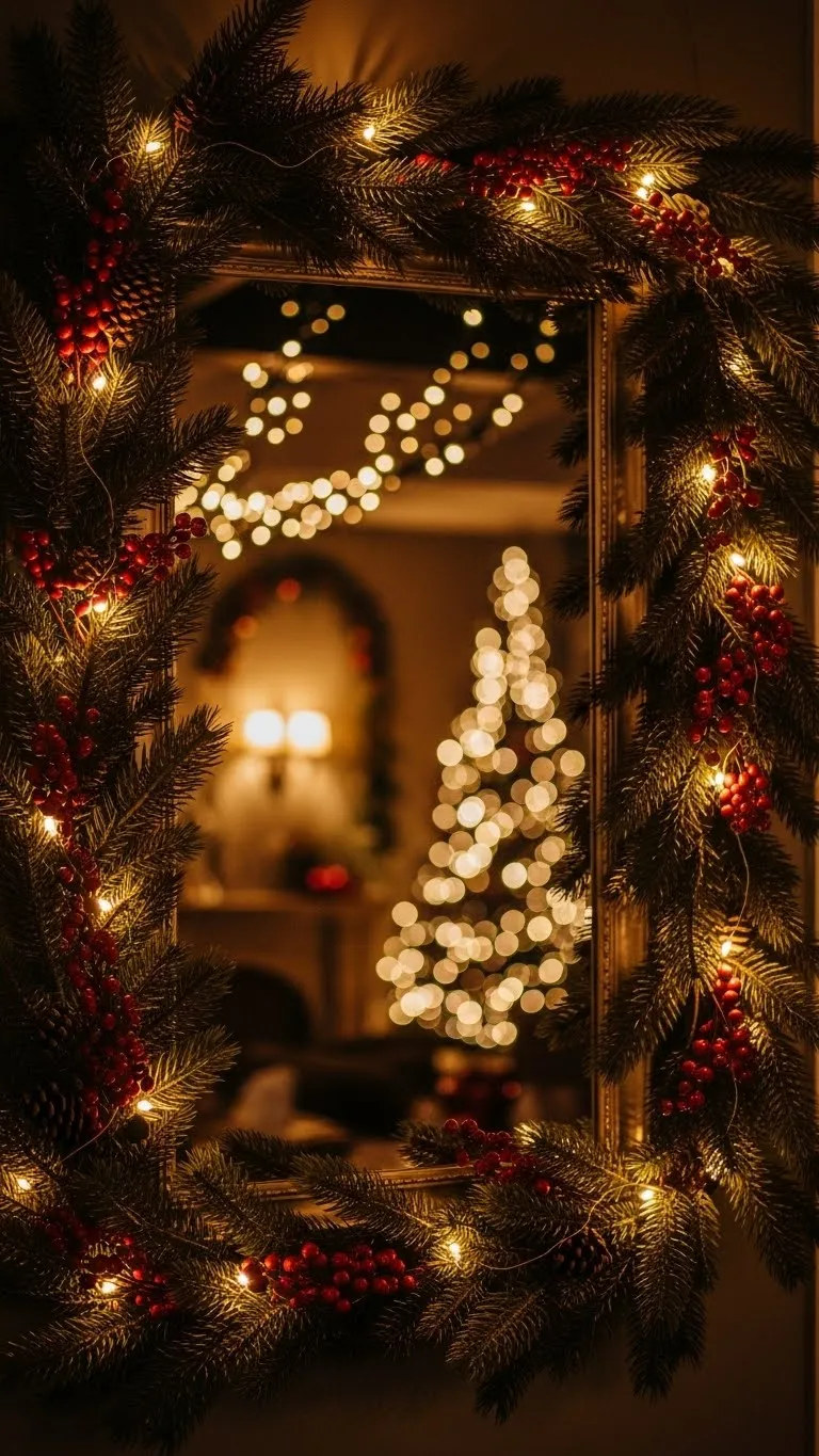 Mirrors can double the festive effect. Drape garlands, ribbons, or small ornaments around the frame. The reflection enhances twinkling lights and decorations. This is a clever way to make rooms feel brighter and more spacious while adding a holiday feel. DIY garlands or ribbons make this an affordable, creative touch.