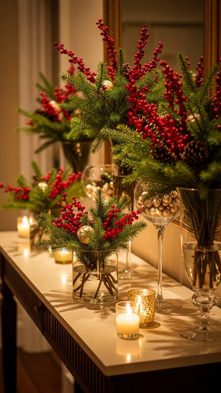 Vases are easy surfaces to decorate. Fill with pine branches, holly, berries, or ornaments. Mix heights and sizes for a layered look. DIY options include painting jars with white or gold accents or adding glitter. Place them on tables, shelves, or mantels. It’s a small, affordable touch that instantly brings festive cheer and elegance to any room.
