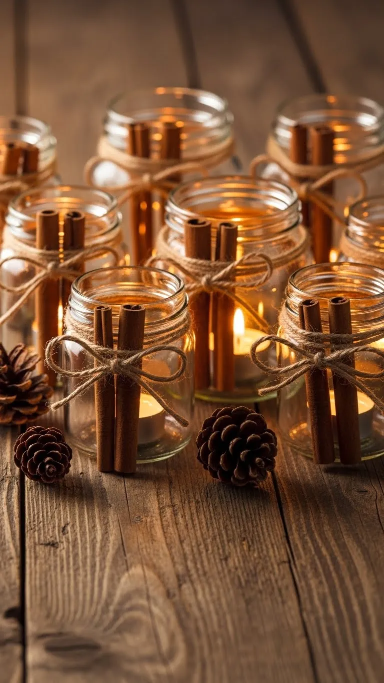 Cinnamon sticks paired with candles add both scent and style. Glue sticks around glass jars, secure with twine, and place tealights inside. The aroma instantly feels holiday-ready, while the jars double as rustic decor. You can use different sizes and group them for a charming centerpiece. This DIY is simple, inexpensive, and fills the room with warmth.