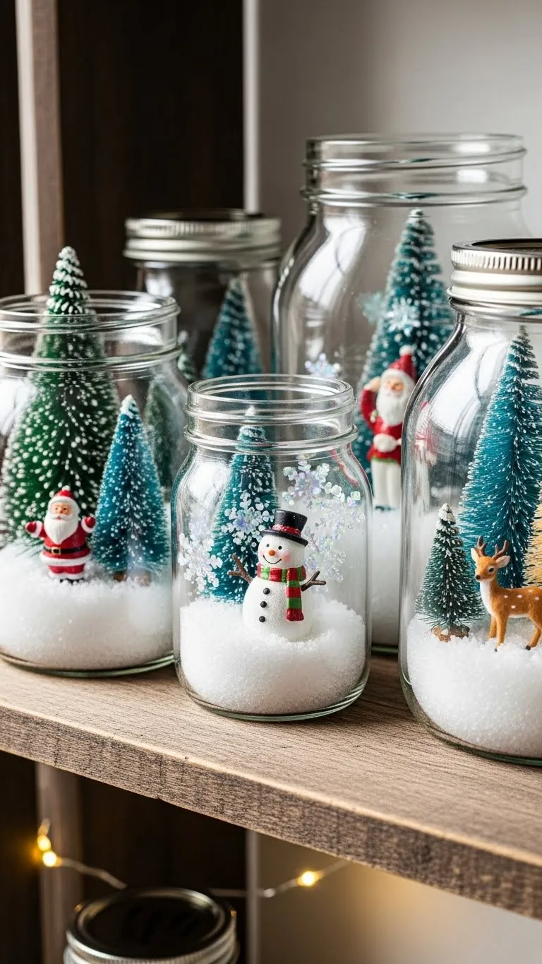 Mason jars make charming DIY snow scenes. Fill jars with artificial snow, mini trees, or tiny figurines. Add glitter for sparkle. They work as table decor or small shelf displays. Kids can help, making it a fun family project. The result feels whimsical and magical without spending much money.