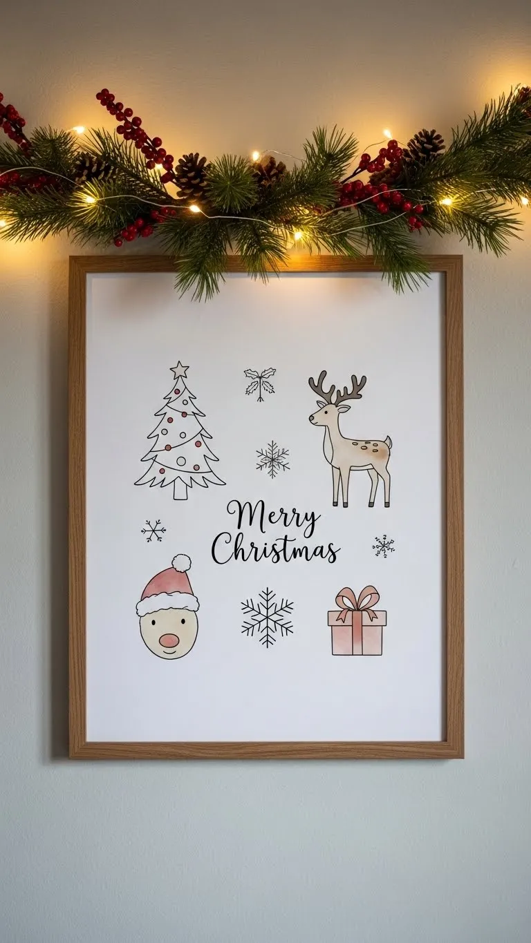 Swap out regular wall art for holiday-themed prints or DIY paintings. Even simple sketches of trees, stars, or ornaments look festive. Frame printables for a polished look. You can also create canvas paintings with acrylics or watercolors. Affordable and easy, it adds seasonal charm without permanent changes.