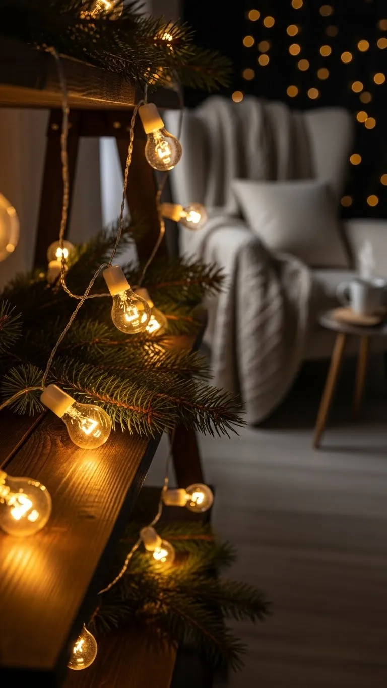 If you have stairs, wrap lights along the rail. Use a loose pattern so it feels relaxed. Add small greenery pieces if you want texture. Use battery lights so cords stay hidden. This small touch improves the look of your entry area. Avoid heavy garland that may sag. Keep the setup simple and easy to remove. This idea works well for guests arriving during the season.