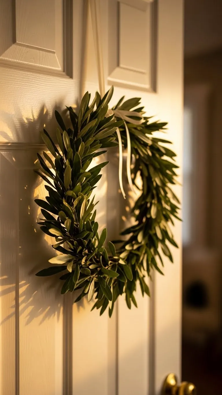 A wreath inside the home adds holiday charm. Hang one on a bedroom door, closet door, or office door. Use a basic green wreath if you prefer a calm look. Add ribbon, dried fruit, or leftover ornaments if you want more detail. You can make a wreath using a wire ring and cheap greenery from craft shops. Interior doors often feel empty, so a wreath makes a nice touch. Keep it lightweight so it hangs easily. If you rent, use a hook that does not leave marks. Choose colors that match your overall room decor. A simple wreath can tie the room together.