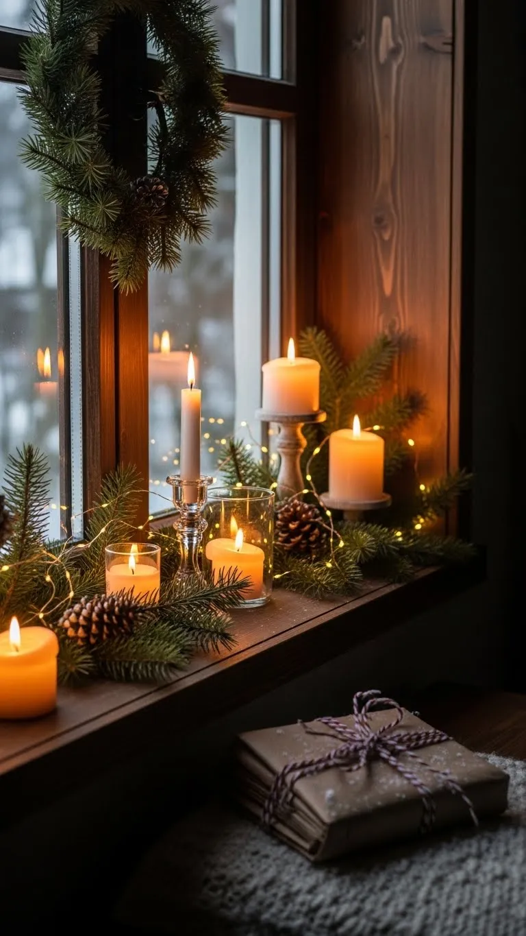 Window ledges are often unused. Add small candles, tiny ornaments, or short garland strands. Keep items low so the view stays clear. Use battery candles if the ledge gets sunlight. For a budget idea, place small mason jars with pine sprigs. This adds height and texture. You can also hang a tiny strand of lights along the top of the window. Keep the design simple so the area feels calm. The soft glow at night looks very inviting.