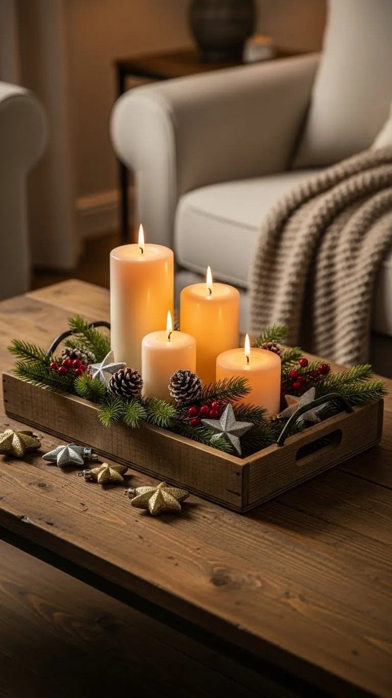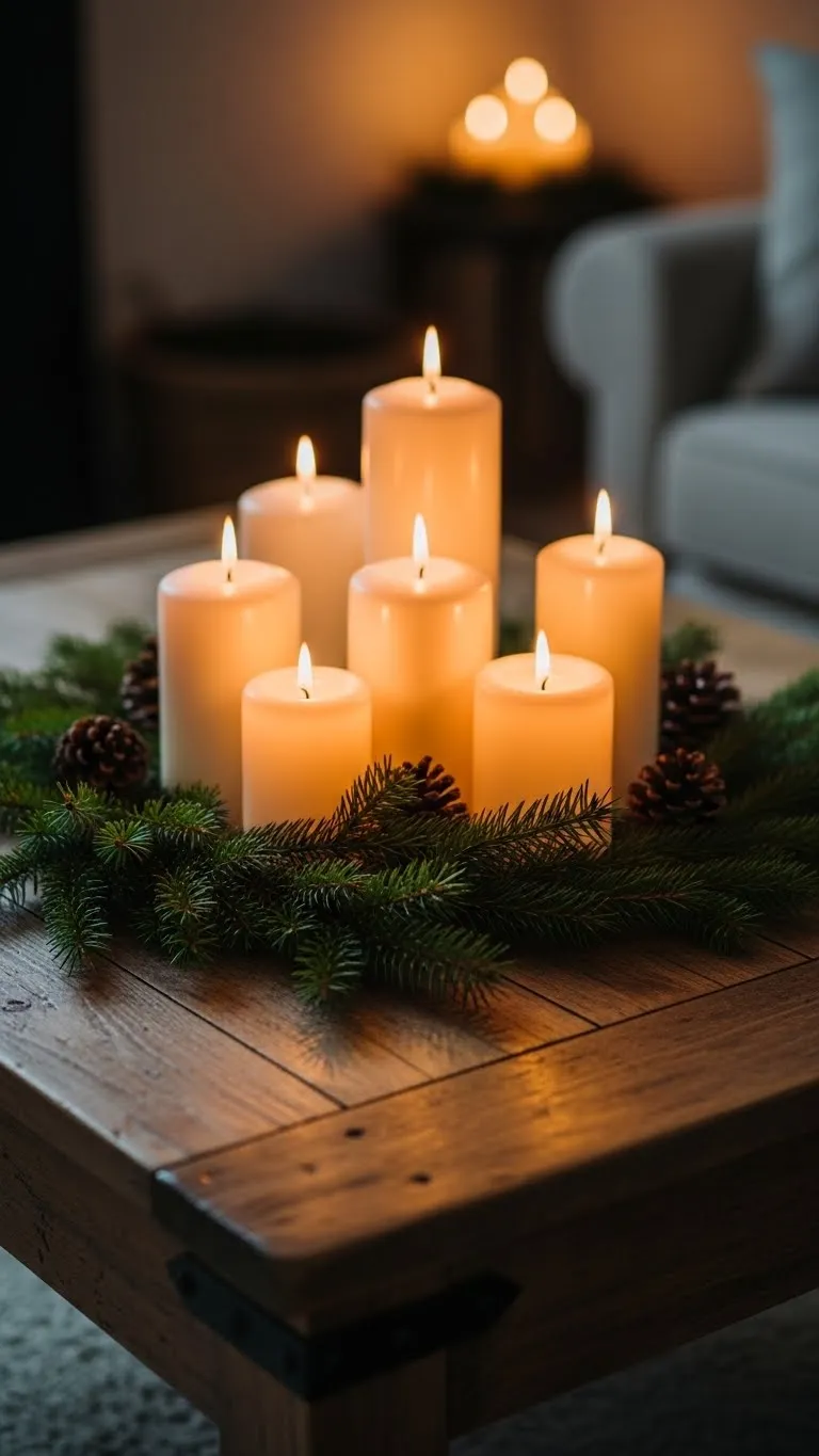 Candles add warmth and shape a peaceful room. Use different heights so the setup looks relaxed. Place them on trays to keep wax off surfaces. You can find low-cost pillar candles in local markets, and they last a long time. Scented versions work well if you enjoy pine or vanilla, but unscented candles feel calmer for small rooms. For safety, try LED candles if you have kids or pets. They mimic real glow without heat. Add small accents like cinnamon sticks or pinecones around the base. Keep flames away from fabrics and garland. Candles work well on coffee tables, mantles, and side tables. A small cluster is usually enough. Soft light helps the whole room feel calmer at night.