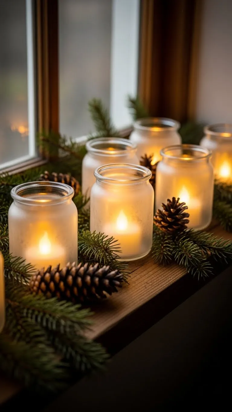 Frosted jars look warm and soft. You can make them using cheap jars and a light coat of frosting spray. Place LED tealights inside for glow. These jars work well on ledges, tables, or mantles. Add small pine pieces around the base. If you want variation, tie twine around the top. This project is low-cost and easy to repeat. The soft light from frosted glass feels calm at night.