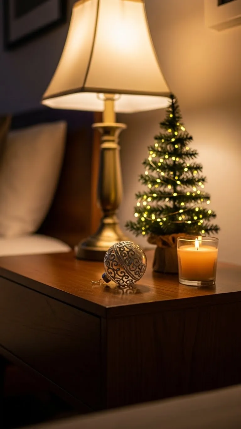 Nightstands can hold small holiday accents without feeling cluttered. Use items like a mini tree, candle, or one ornament. Keep the colors calm so the room still feels restful. A small light strand inside a jar also works. This idea takes only a moment to set up. It adds charm to evenings and mornings. Use items you already own so you do not overspend. A single accent goes a long way in a bedroom.