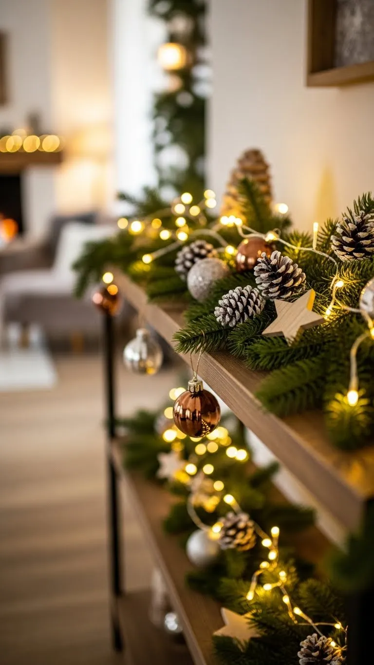 Natural or faux pine garland adds texture and fills empty spots. Place it on shelves, mantles, or along door frames. Shop for simple garland strands since detailed ones cost more. You can add small touches like dried orange slices, ribbon strips, or leftover ornaments. This keeps the design personal. If the garland feels flat, tuck in bits of real branches from your garden. It adds a natural scent too. For renters, try command hooks so the garland stays in place without marks. Keep the layout loose rather than tight, so it feels relaxed. You can mix short and long pieces based on your space. Garland also works well with warm lights if you want a soft glow. If not, the greenery alone still looks warm and inviting. This simple addition fills the room with holiday vibes.