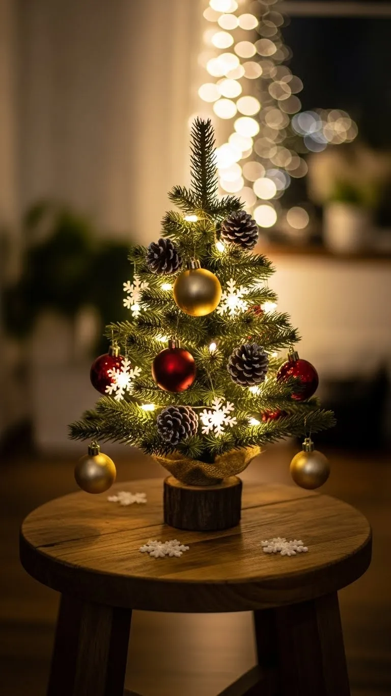 A mini tree is perfect when you prefer something simple. Place it on a table, stool, dresser, or sideboard. Choose a compact size that fits the room without feeling crowded. You do not need many ornaments. Stick with small shapes or natural items like pinecones. If you want a budget option, use a branch bundle in a tall vase and place tiny lights around it. This creates a tree-like shape without the cost. You can wrap the base with leftover fabric or a scarf for a softer look. A mini tree works well if your main room is already busy or if you want a second tree in a corner. It adds charm without taking space. Keep the colors calm and simple so it blends easily.