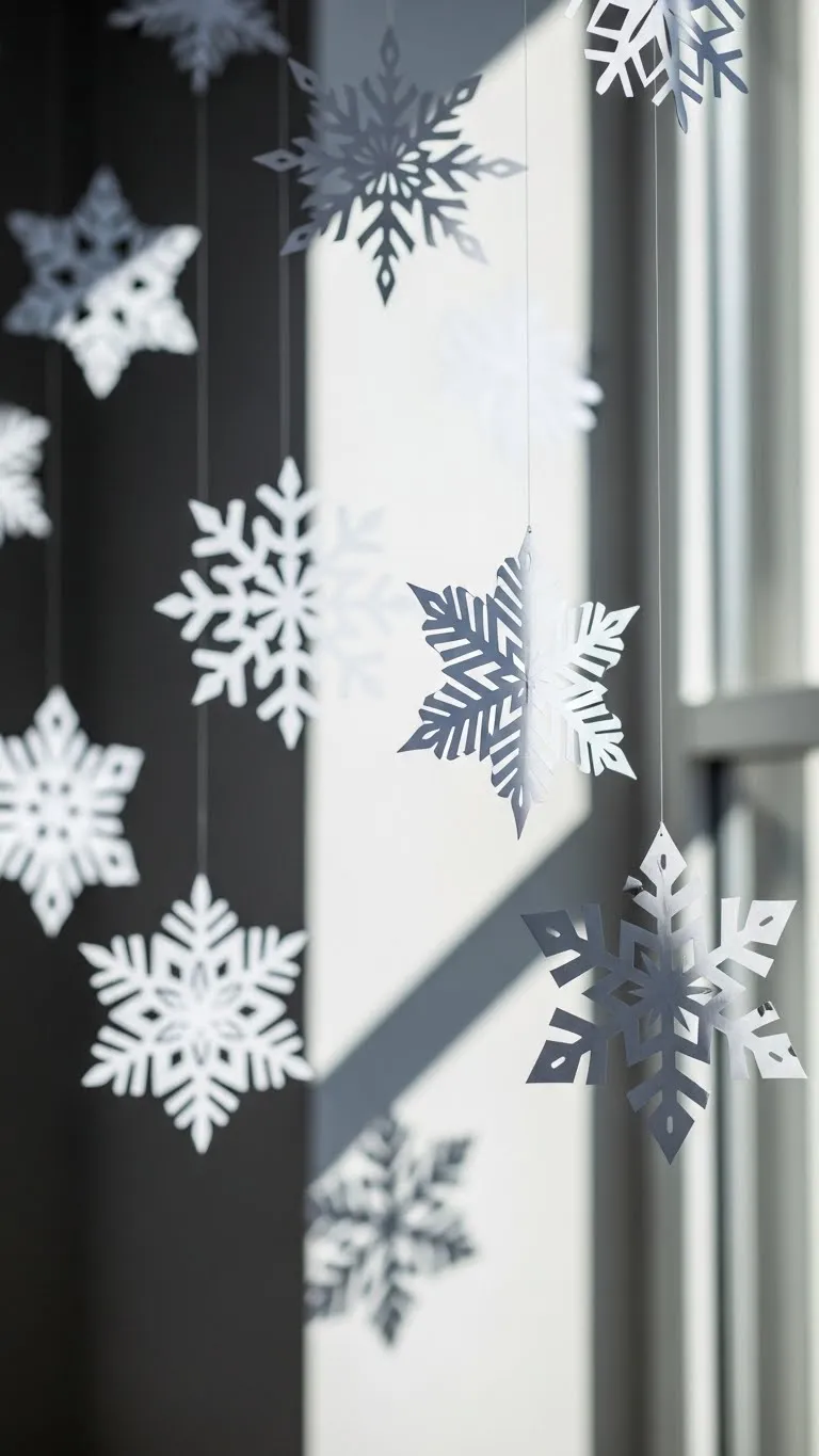 Paper snowflakes are low-cost and fun to make. Use simple white paper and scissors. Hang them from clear thread so they appear floating. Place them near windows or above a reading chair. Kids can help cut designs, making the room feel personal. You can attach a few to walls with removable tape. For a softer look, use thin tissue paper. Mix large and small snowflakes to fill space. This craft fills empty corners without extra furniture. If the room feels too plain, add a small cluster above a shelf. Keep them spaced apart so they do not look crowded. These little touches bring winter charm without spending much.