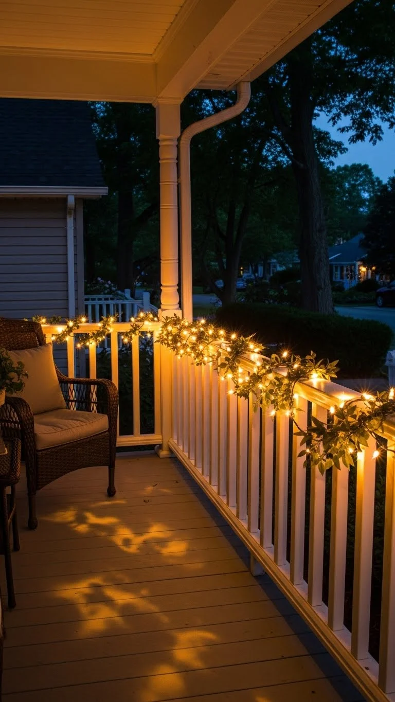 String lights bring warmth instantly. Wrap them around railings, frames, or planters. Warm white tones feel calm and simple. If you want to reduce cost, check last year’s storage first. Hang them carefully so the lines stay neat. Avoid excessive loops or tight knots. One strand often covers more space than expected. Battery-powered or plug-in options both work, depending on your setup. Lights brighten the whole porch, especially during shorter winter days.