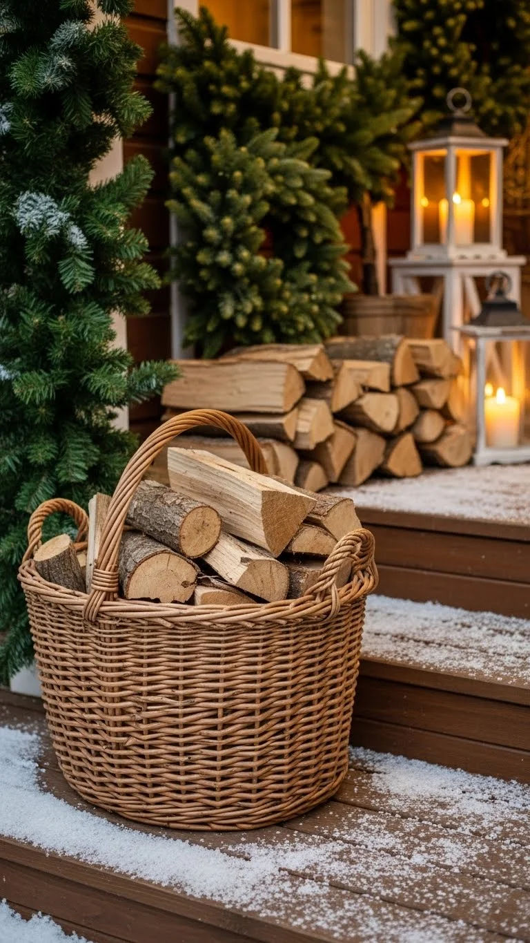 A basket of firewood creates a rustic winter look. Even if you don’t have a fireplace, the wood adds natural charm. Stack the pieces neatly so it feels intentional. You can find low-cost baskets at thrift stores or reuse one from your home. Add a few pine branches around the edges for color. This setup works well in a corner or beside the bench. It adds texture and helps the porch feel warm without adding lights or ornaments.