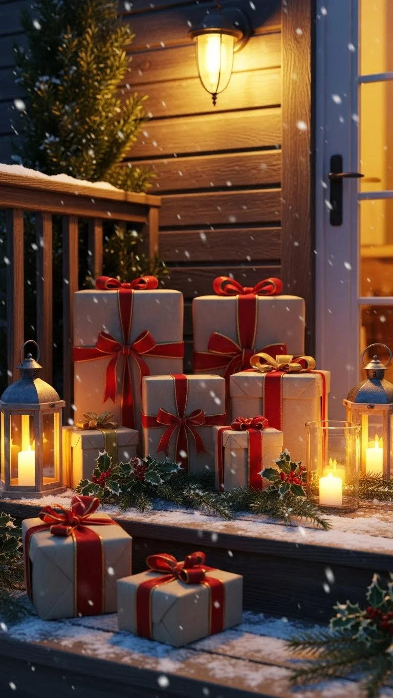 Decorative gift boxes are easy to assemble. Use old cardboard boxes and wrap them with leftover paper or fabric. Pick patterns that match your porch theme. Add a simple ribbon for color. Place the boxes under a bench, near the door, or beside a planter. They fill space quickly without much expense. Avoid leaving them where they can get soaked if you expect rain. These boxes give the porch a playful and cheerful touch.