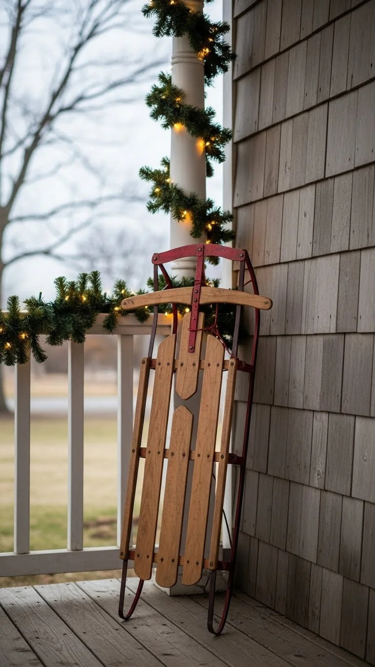 A vintage sled adds charm and a touch of nostalgia to the porch. Lean it gently against the wall or set it beside the door. Add a small wreath or a strand of lights for interest. If you don’t already own one, check secondhand shops or ask friends. Even a slightly worn sled adds character. Keep the rest of the scene simple so the sled stands out. This decoration works well for both small and large porches.
