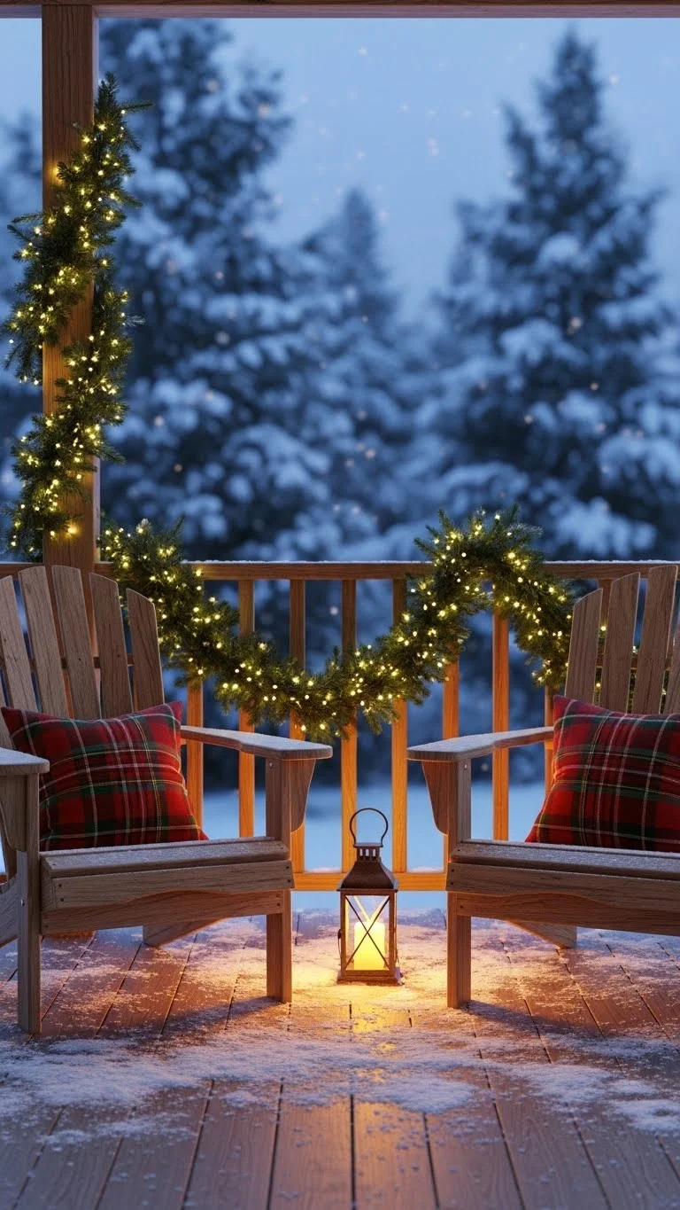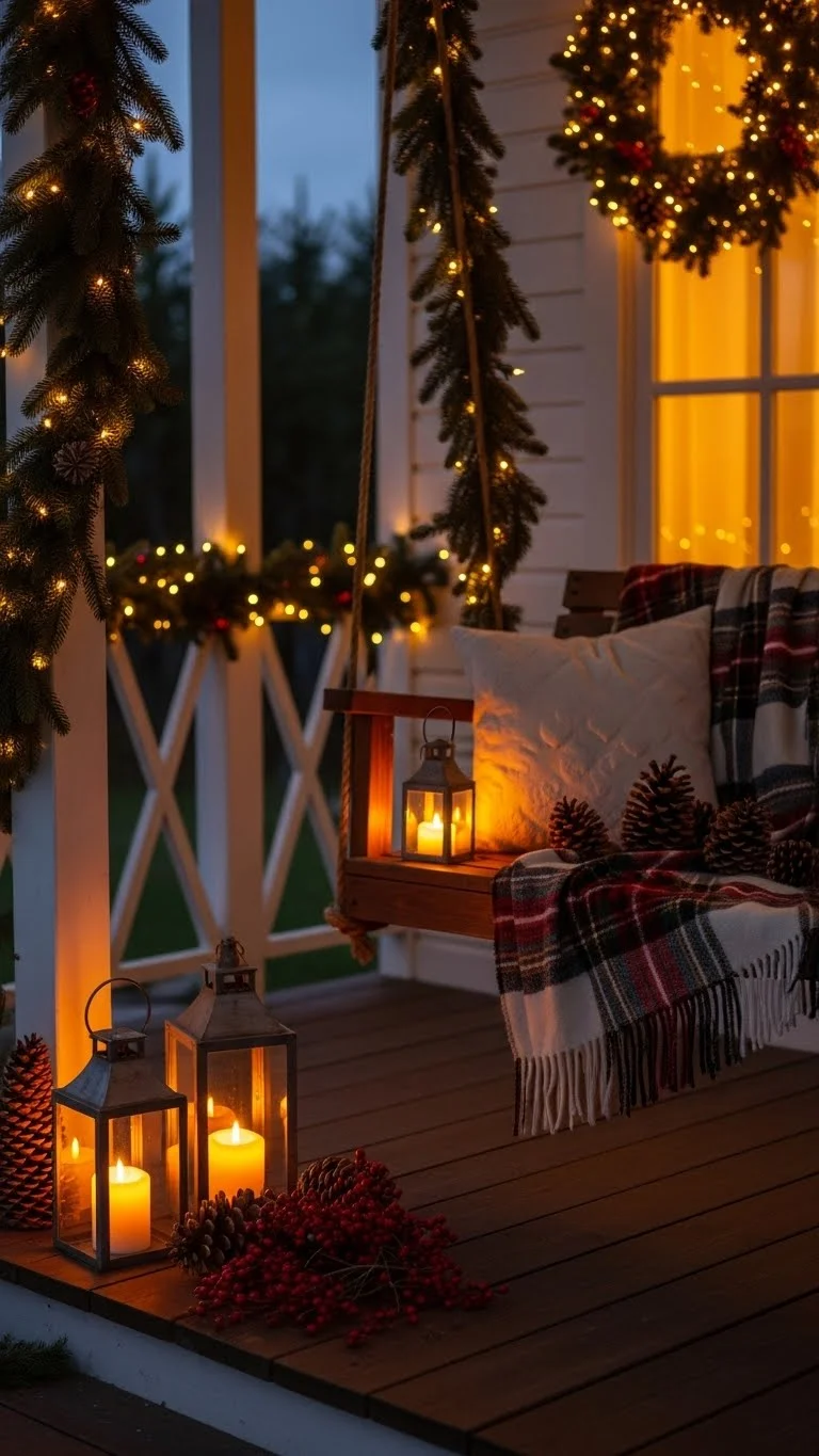 If you have porch chairs, small seasonal pillows make them look cozy. Choose patterns that fit the winter theme, like plaid or simple stripes. Avoid brighter colors if you want a calm look. You can also add a blanket to one chair for added texture. Check discount stores for low-cost pillow covers you can reuse each year. This idea works well for small porches because it adds comfort without taking up extra space.