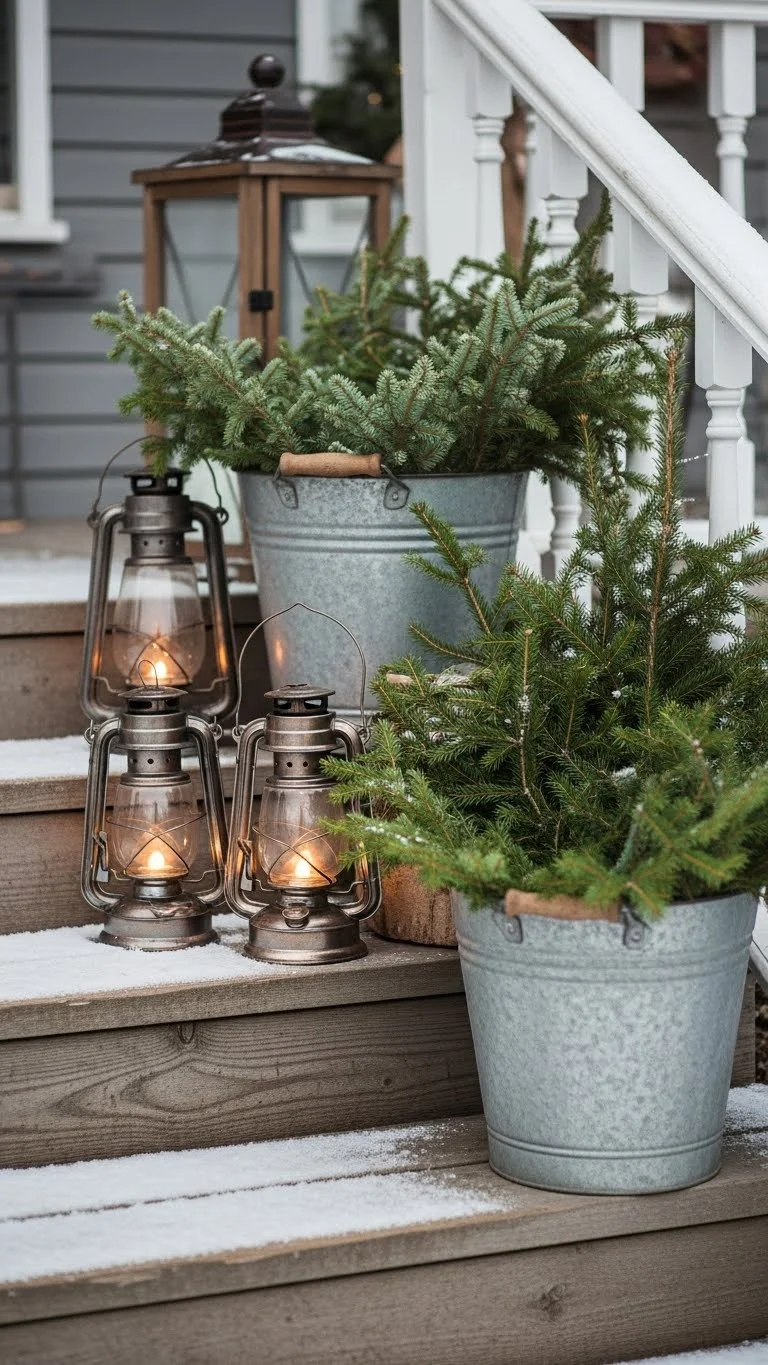 Metal buckets offer a simple way to hold winter greens. Fill them with branches from your yard or leftover trimmings from a tree lot. Add berries or pinecones to bring color. Set the buckets at different heights for interest. You can place a small brick inside one bucket to raise the greens. This option is inexpensive and works for narrow porches because it doesn’t take up much space. The metal adds a charming rustic touch.