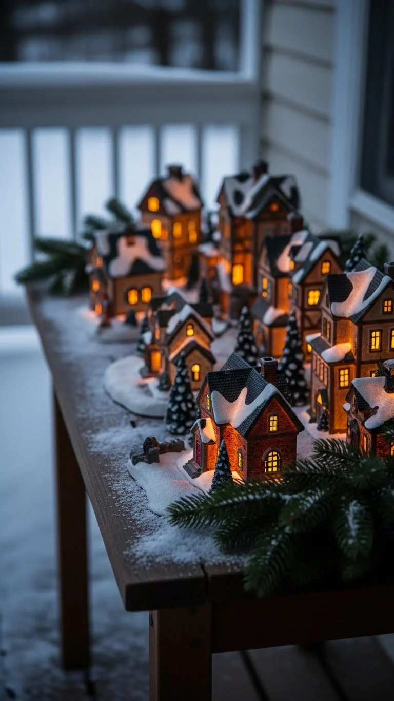 A small winter village adds charm and personality to the porch. Place it on a side table or crate. Choose a few small houses with soft lights. Surround them with bits of greenery for texture. If the pieces are fragile, set them farther back from the walkway. You don’t need a full village; even two or three houses look charming when arranged thoughtfully. This idea brings a warm indoor touch to the outdoor space.