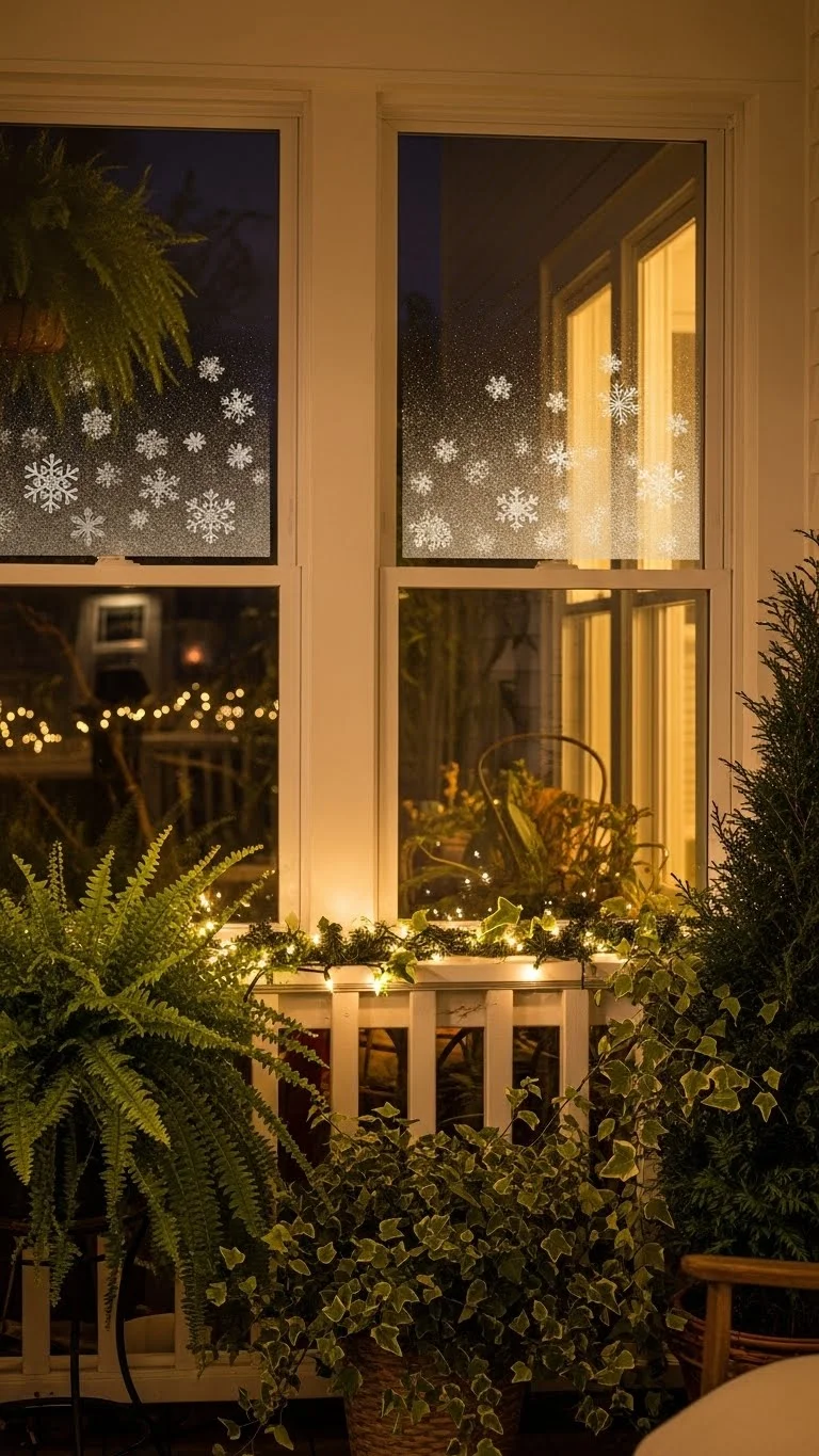 Window clings are inexpensive, easy to apply, and simple to remove. Snowflake patterns work well because they look timeless. Clean the window first so the clings stick well. Place them at different heights for a natural look. You can pair them with soft lights or greenery around the frame. This is a good option for renters or anyone who wants decorations without hardware. Even a few clings can add charm and help the porch feel more polished.